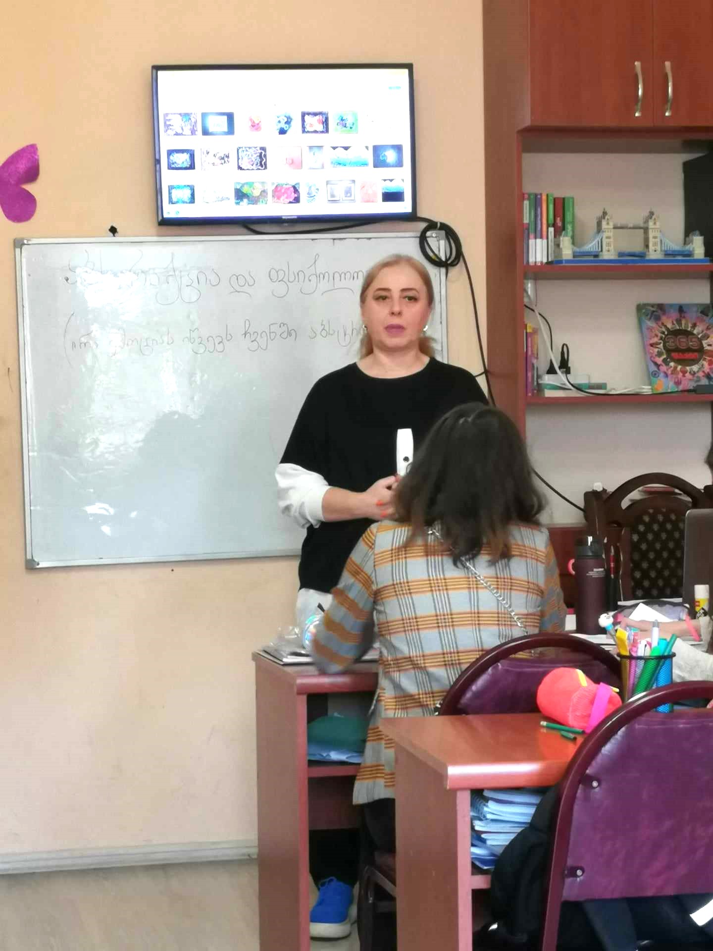 სკოლა ,,პოლიგლოტის“ ფსიქოლოგმა, თეა ჯაღიაშვილმა და სახვითი და გამოყენებითი ხელოვნების მასწავლებელმა, სოფიო ლიჩელმა მე-5 (ა) კლასში ინტეგრირებული გაკვეთილი ჩაატარეს თემაზე: აბსტრაქცია და ფსიქოლოგია (რა გრძნობებს იწვევს ჩვენში აბსტრაქცია).